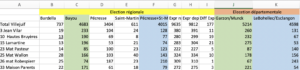 Le résultat est spectaculaire ! Le Bohellec (colonne K) n’atteint qu’épisodiquement le score des partis censés le soutenir (col. F) . Au contraire, P. Garzon et Flore Munck recueillent, au-delà de la liste Bayou, le suffrage de personnes votant au même moment macroniste ou lepeniste.